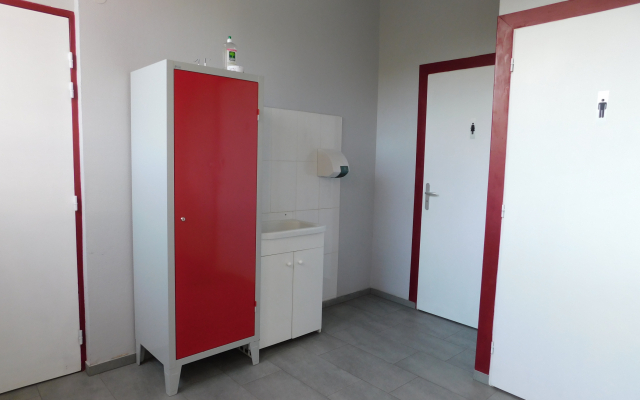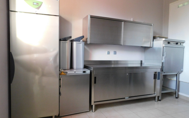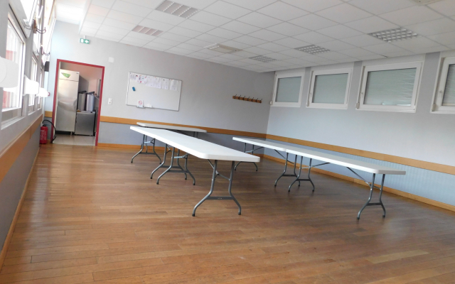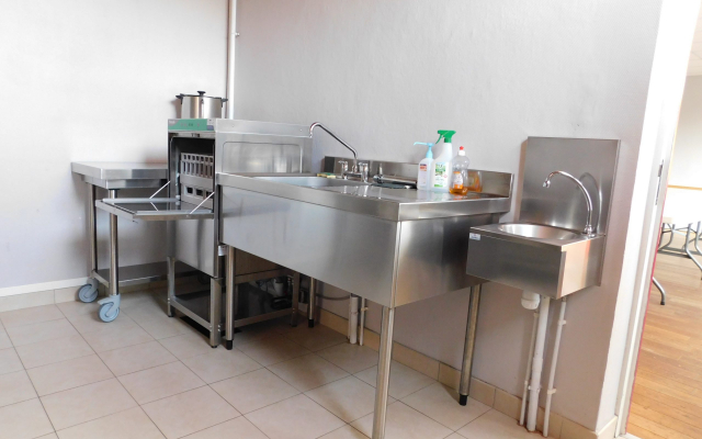 Tables, chaises sont mis à disposition, ainsi que de la vaisselle, un four pour réchauffer, un lave vaisselle, frigo, congélateur et évier.